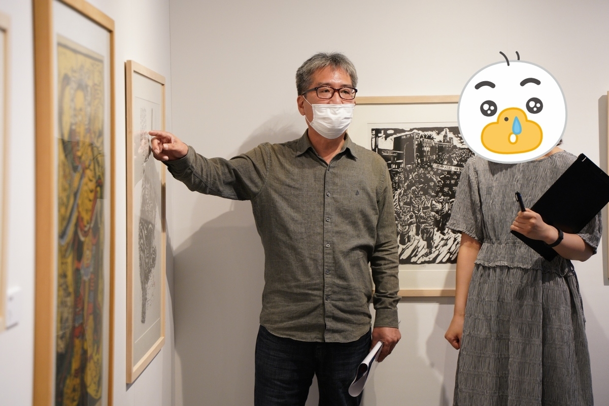 韓国人Bさん:正直、見る前まではただ政治的・社会的な意識が投影された作品が展示されているのだろうと思っていた。ところが、実際に展示を見てみると、ひとつひとつのクオリティに非常に驚いた。極度に精巧な版画ととても卓越した絵が(もちろん政治